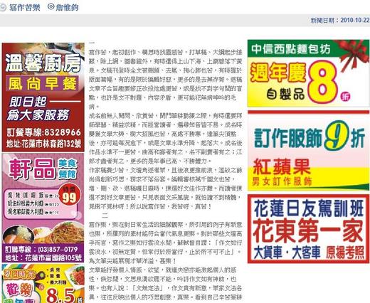寫作苦,起初創作、構思時找靈感苦,打草稿、大綱起步維艱,除上網、圖書館外,有時還得上山下海、上窮碧落下黃泉。文稿刊登時全文被刪頭、去尾、掏心肺也苦,有時囿於版面篇幅,有的是限於編輯好惡,更多的是去蕪存菁。退稿文章不合旨趣要修正改投他處更苦,或是找不到字句間的盲點,也許是文不對題、內容矛盾,更可能犯無病呻吟的毛病。