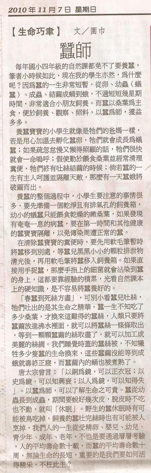蠶師 2010.11.7人間福報生命書寫【生命巧聿】專欄
