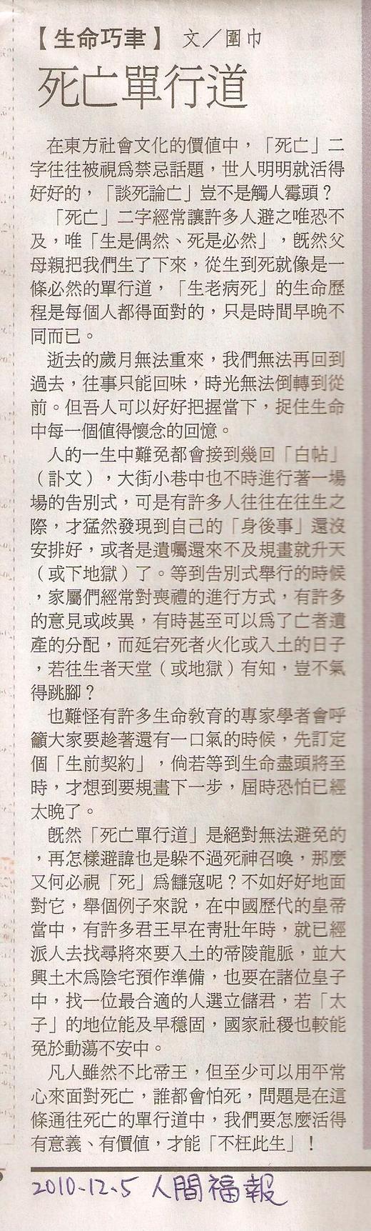 死亡單行道 2010.12.5 人間福報生命書寫【生命巧聿】專欄