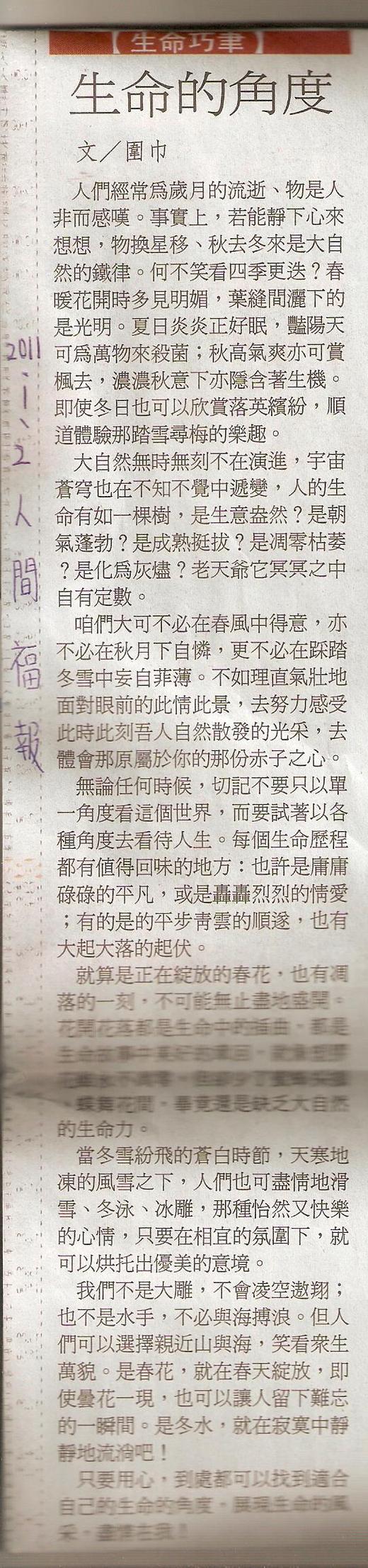 生命的角度 2011.1.2 人間福報生命書寫【生命巧聿】專欄