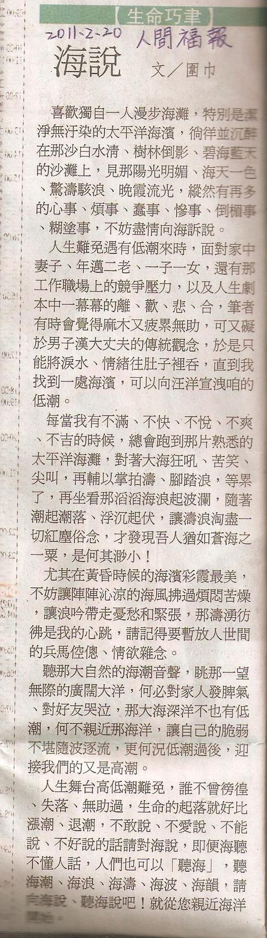 海說 2011. 2 . 20人間福報生命書寫生命巧聿專欄