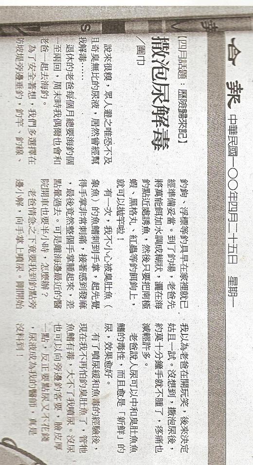 有了噴尿緩和魚毒的經驗後,現在我不再怕釣臭肚魚了,管牠魚鰭有毒,大不了我噴尿。沒尿也可以向旁邊釣客要,臉皮厚一點,反正要點尿又不花錢,尿液成為我的醫師,真是沒料到!