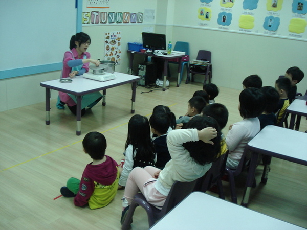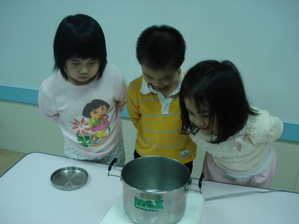 之後請孩子們猜一猜將冰塊加熱後會發生什麼事呢?!孩子們紛紛發表意見,有孩子覺得冰塊會融化,也有孩子說冰塊會變成水,Cloud班的孩子都已經有些概念囉!每位孩子輪流到台前近距離觀看,孩子們都能遵守安全將小手擺背後。
