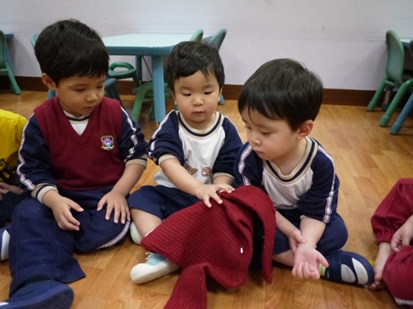 在觸摸的過程中,寶貝們們紛紛表示出,襯衫摸起來的感覺是柔柔的,毛衣則是粗粗的,能表達出衣服種類不同,材質也不盡相同唷!