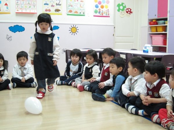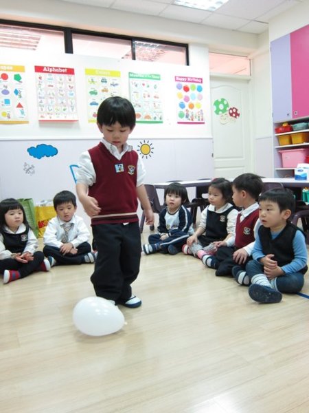 接著下來,寶貝們要與大象一起踢球囉!首先,我們吹了一顆氣球讓寶貝們練習,寶貝們看到了氣球都興奮不已,紛紛舉手躍躍欲試。為了培養寶貝們「輪流」的好習慣,我們讓寶貝一個接著一個輪流出來練習。一剛開始時寶貝們有點不知所措且東倒西歪的站不穩,但經過一次又一次的嘗試與練習,寶貝們漸漸知道要先瞄準再發球!快來看看我們Sunshine寶貝們的厲害吧!