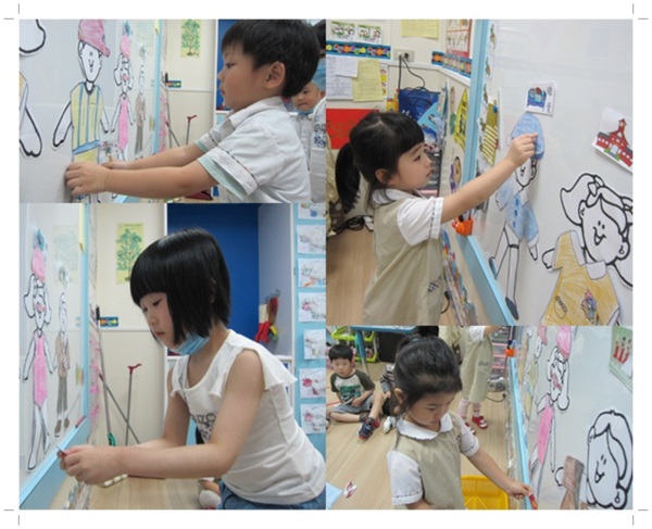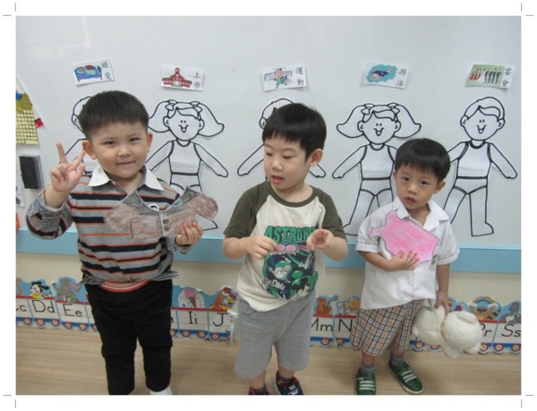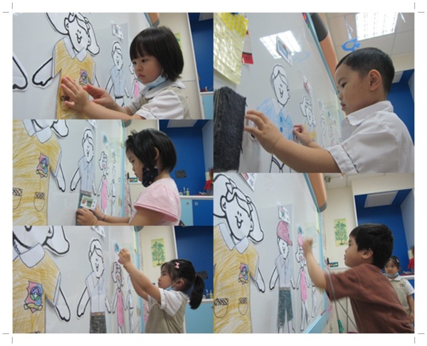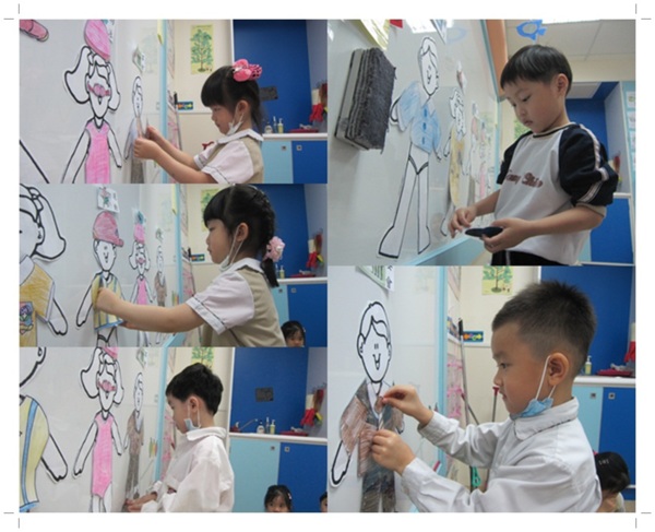 為了加深幼兒穿著服裝的概念,我們進行『娃娃穿衣服』的遊戲,幼兒依照不同的場合幫紙娃娃穿上正確的衣服,小朋友們看到沒穿衣服的紙娃娃都會感到害羞,都很努力的完成服裝配對,看到紙娃娃都穿上合適的服裝,幼兒都非常的開心呢!希望能藉此活動,讓幼兒更了解服裝的穿著禮儀,也能為自己選擇適當的服飾穿著。