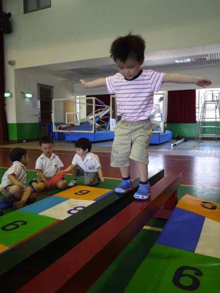 經過一連串的伸展運動後,接下來就是準備進行活動啦!活動前準備兩根獨木橋搭起通道,兩邊鋪上軟墊,保護幼兒的安全,待一切準備就緒後,接下來就是冒險的開始,請Snow班的小青蛙雙手打開,保持身體平衡慢慢走到橋的對岸,哇~這樣驚險的畫面,真是讓人捏把冷汗,小心!別掉下去了!不要緊張,Snow班的同伴們會幫忙打氣呢!加油呀!