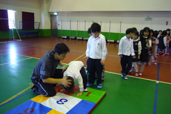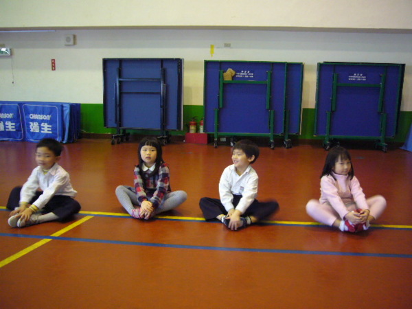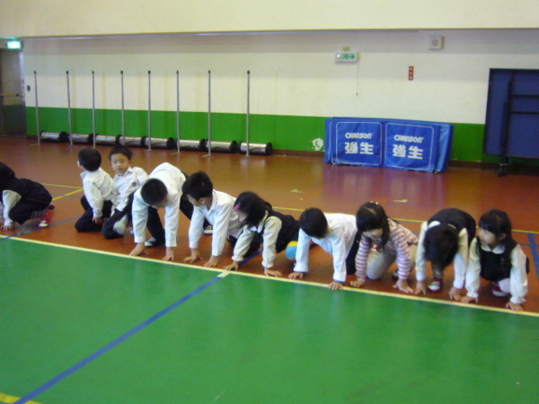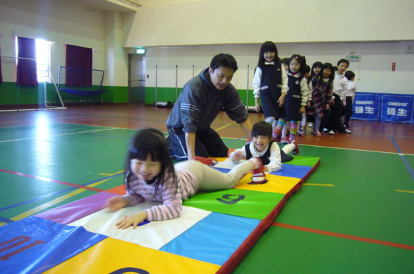 今天進行的是「墊上運動」,你別小看這個軟墊,它可是阿拉丁的魔墊,讓我們在上面學小貓爬,還能騎馬打仗、划小船和翻跟斗,最特別的是變成吐司麵包,把老師當成夾心,一口吃下去囉!透過故事遊戲的方式,加上孩子獨特的想像力和創意,讓每一項活動精彩萬分,捨不得喊卡呢!