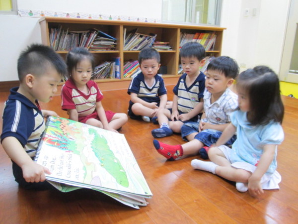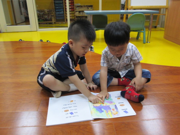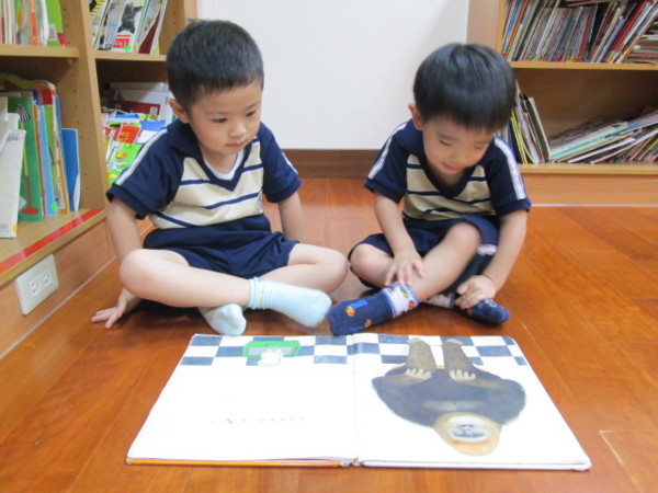 噓!孩子們都專注的看著故事書,並開心的與同學分享著所見之物,但是要請大家小心的保護每一本書,愛護書本就可以與所有人共同分享閱讀的快樂喔!