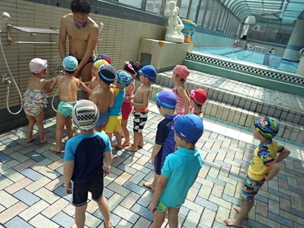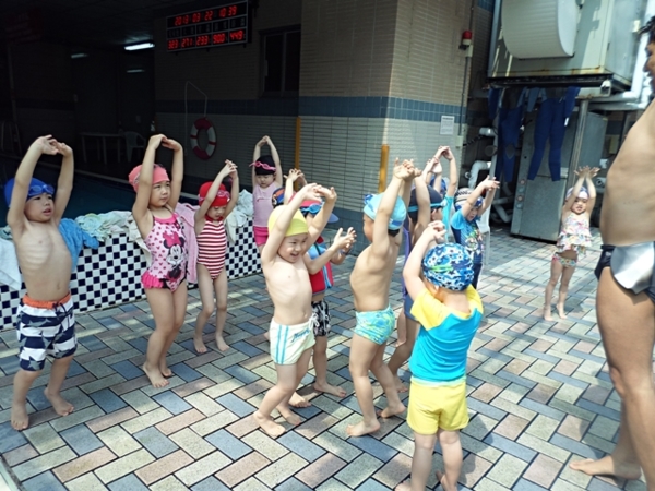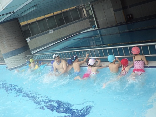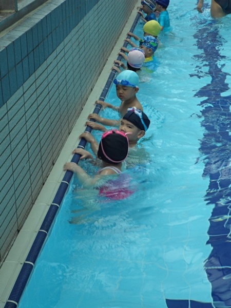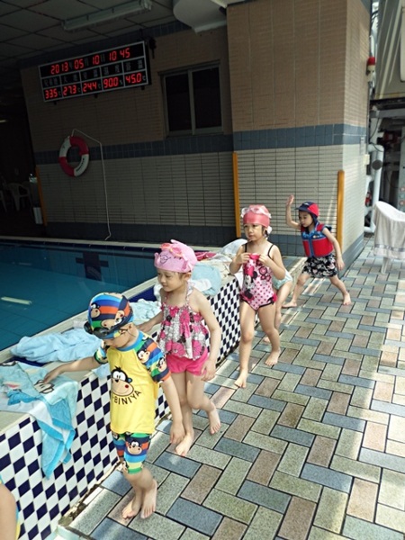 在下水之前,包子老師會帶著寶貝們先在池邊做熱身操,適應水溫,每位小朋友都迫不急待的想要跳下去,畫面真是熱鬧啊!有的小朋友很緊張,有的小朋友害怕的哇哇大叫,但是大部分都是初生之犢不畏虎,完全沒有膽怯的模樣呢。