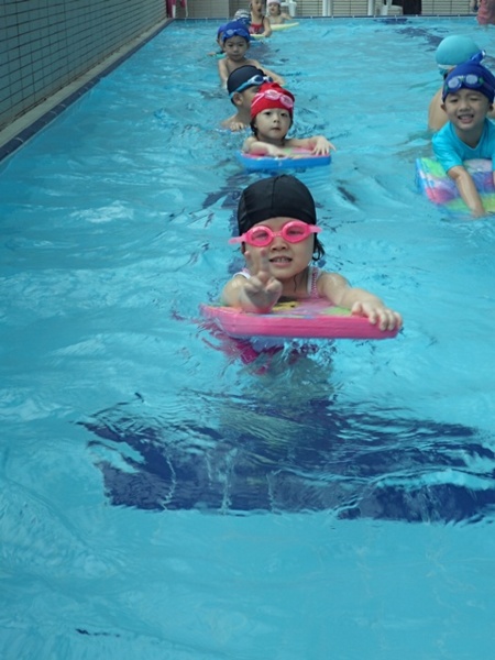 現在要下水嘍!寶貝們很有秩序的一個接著一個,彷彿一群小鴨子般的優游自在。寶貝們真的玩得很開心,一會兒大玩潑水遊戲,一會兒高興的比Ya,這樣的情景是小朋友們童年生活中最美的畫面。