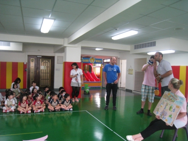 故事的尾聲,我們也一起加入『搶救屈原大作戰』活動,由於汨羅江有許許多多魚和蝦子,我們利用報紙製作而成的球代替肉粽,在河邊努力的丟,希望可以丟中這些大魚不去接近屈原。