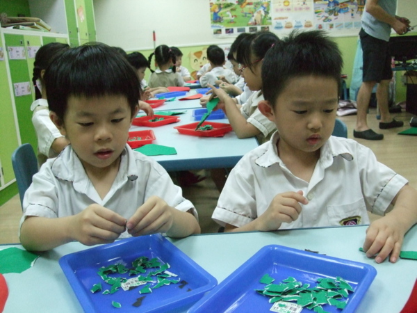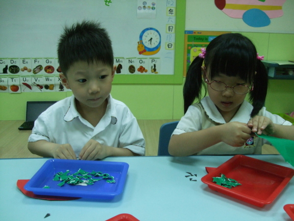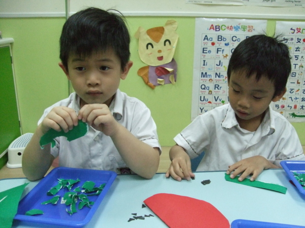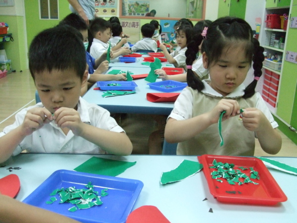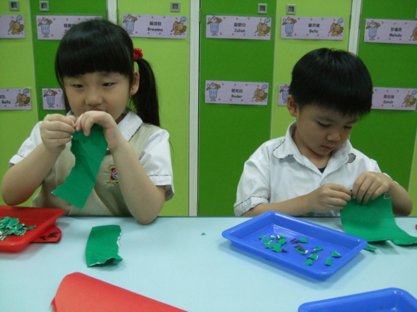 大家在課堂中討論著最喜歡的水果有哪些?票選第一名的就是西瓜喔!於是在美術課程中,Teacher Michael帶寶貝們動手做西瓜,首先剪下紅色的大圓對摺一半,接著用小手撕綠色的紙是西瓜皮的部分,再貼上黑色的小籽,看看大家全神貫注的樣子,是不是很可愛呀!