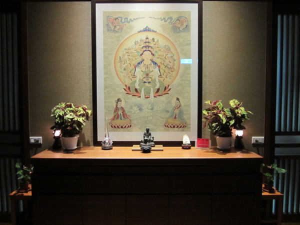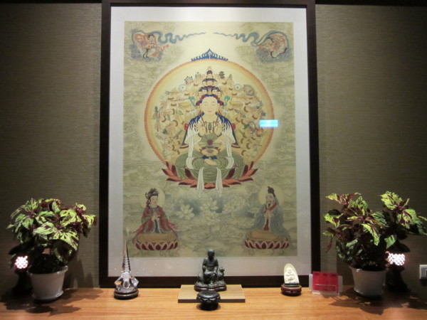 我說:「我畫這張觀音像就是以暗紅色和綠色為主調,想不到這供花的顏色和菩薩像一致。我們就算自己去找供花,絕對不會想到顏色的搭配吧。」