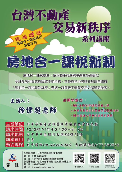房地合一課稅誕生,使不動產交易秩序產生急遽變化,令許多房仲業者與民眾不知所措。本會與台中考銓文教,聯合開辦「房地合一課稅新制講座」,帶您一起探索不動產交易之課稅新秩序。