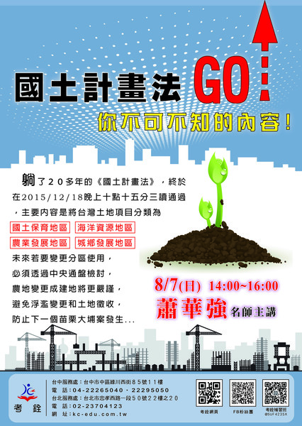 躺了20多年的<國土計畫法>,終於在2015/12/18晚上22:15分三讀通過,主要內容是將台灣土地分類為: