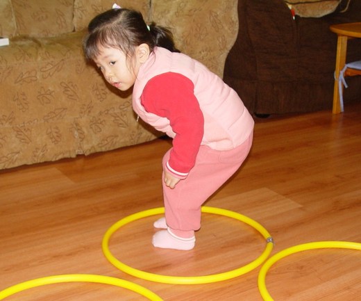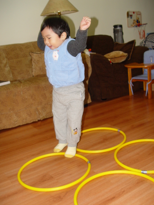 兩歲半及兩歲二個月;教他們跳有指令式的雙腳跳,訓練