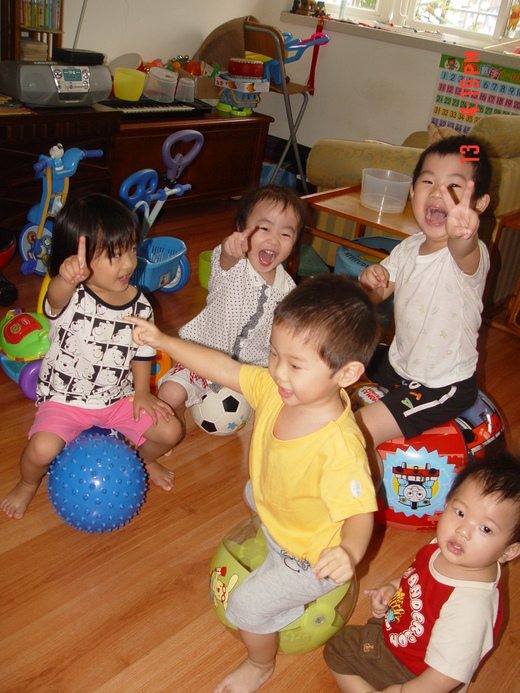 大夥兒玩球玩著玩著,將球當坐椅子, 又一種玩法