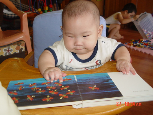 六個月就會坐了,給他任何[玩具]都很有動機的把玩觸碰.