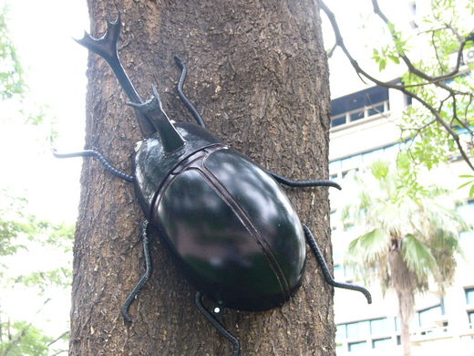 高大的樹幹上,最近停滿獨角仙、小瓢蟲等各式各樣的「人造昆蟲」