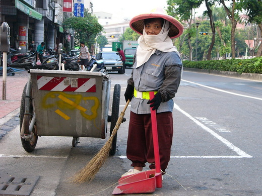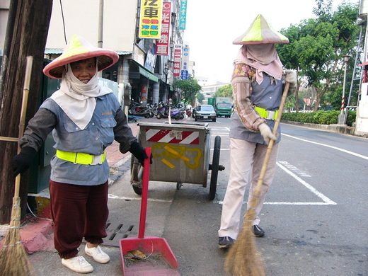 用力踩,加快速度,以免落人於後,她從每天清晨6時開始掃馬路,