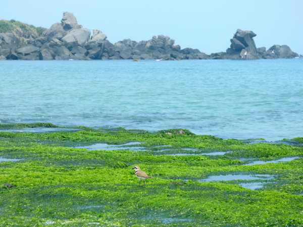遠處有風稜石,近處有水鳥綠藻,美麗的圖畫!