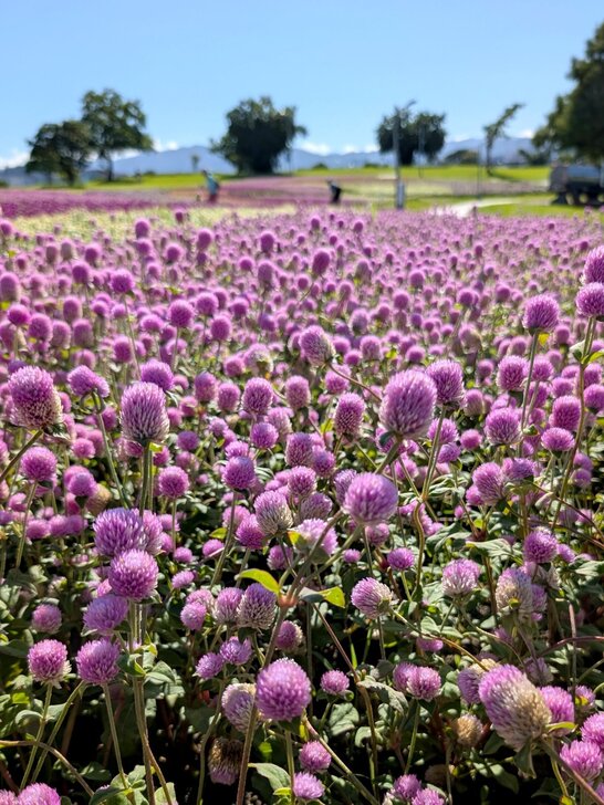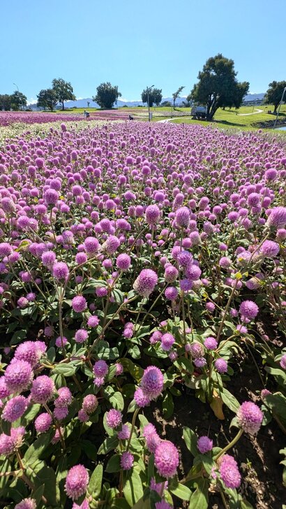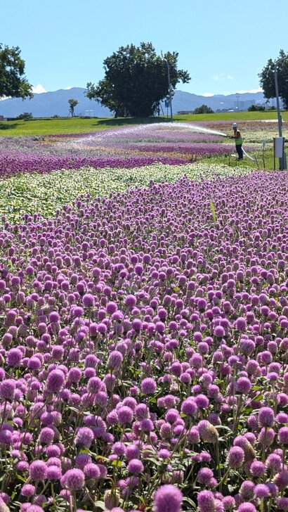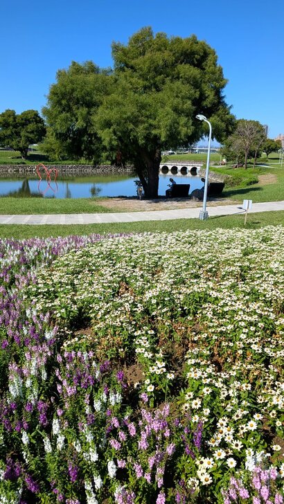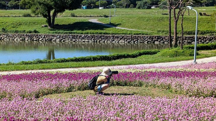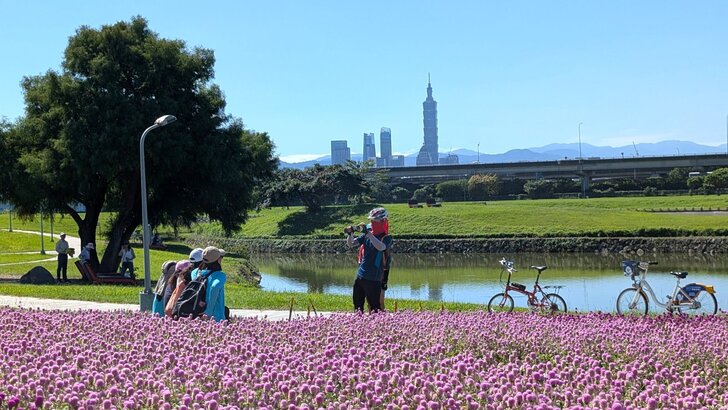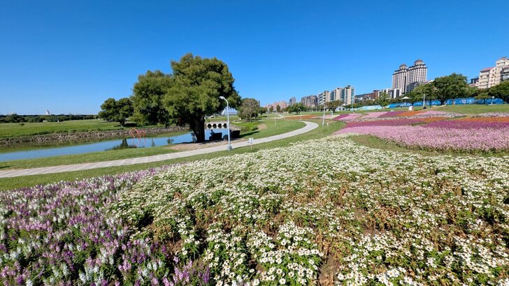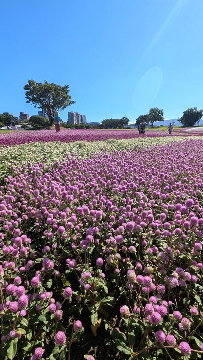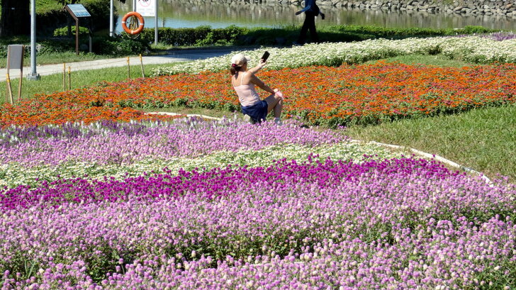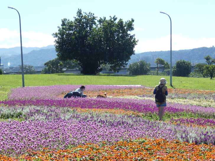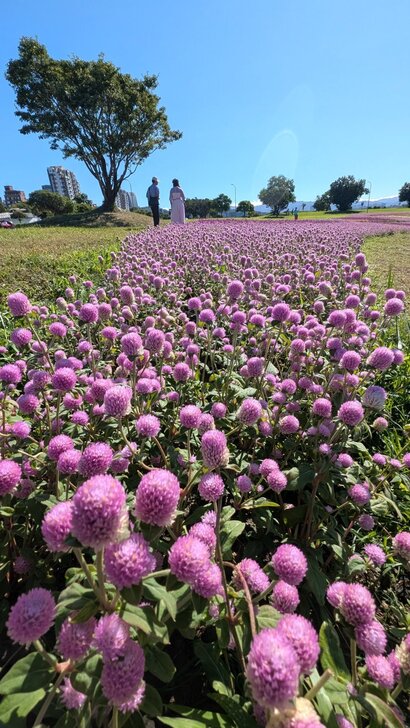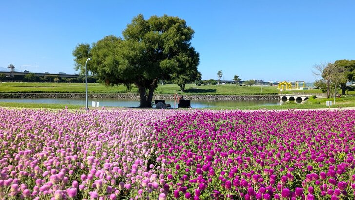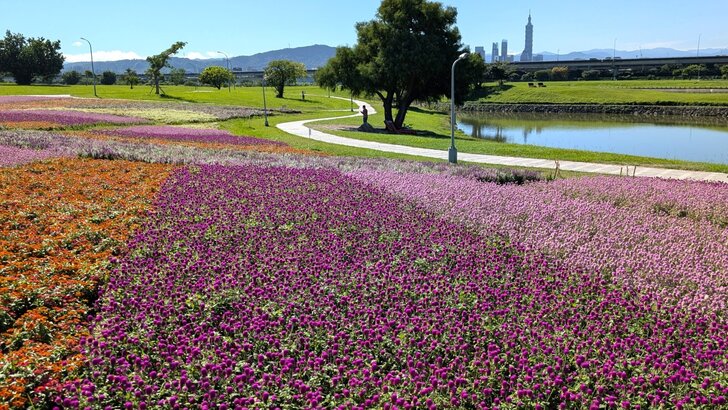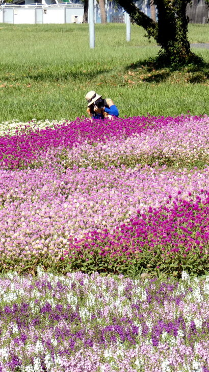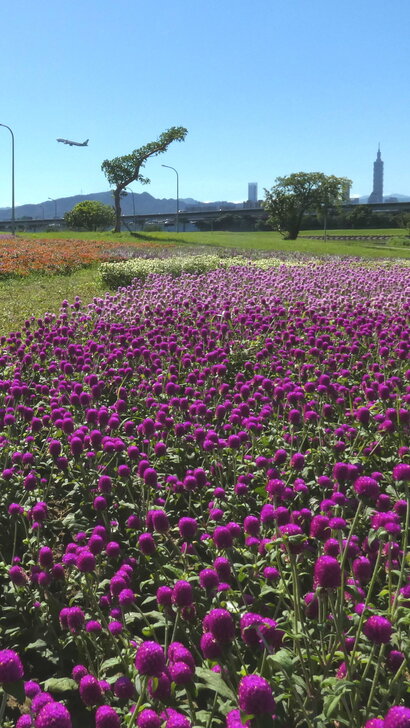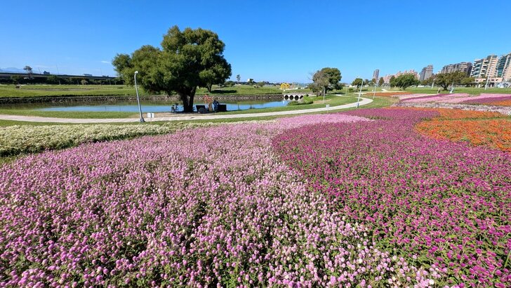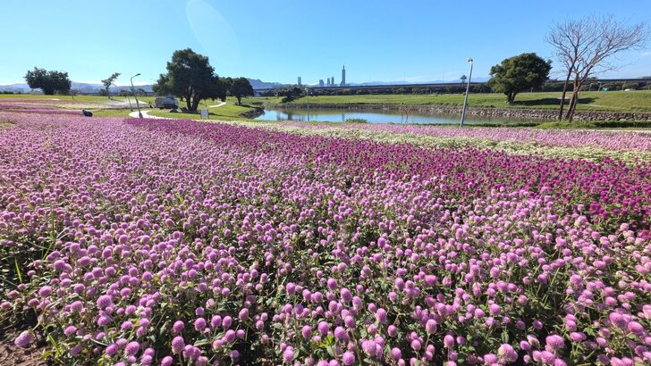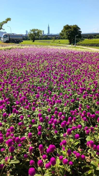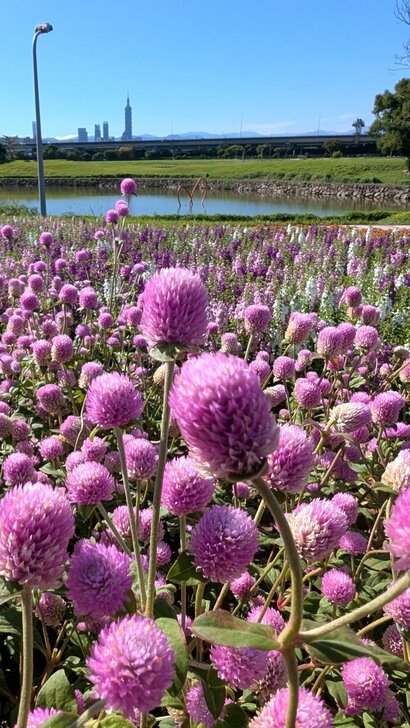 美堤公園花海每年大約十月展開,在河濱水灣間闢出一小小美麗天地,花海主要以特殊品系千日紅(圓仔花)為主,輔以天使花及小百日草.↑