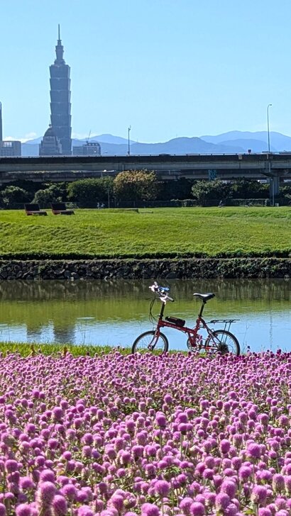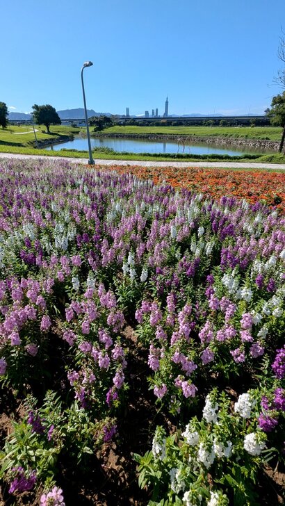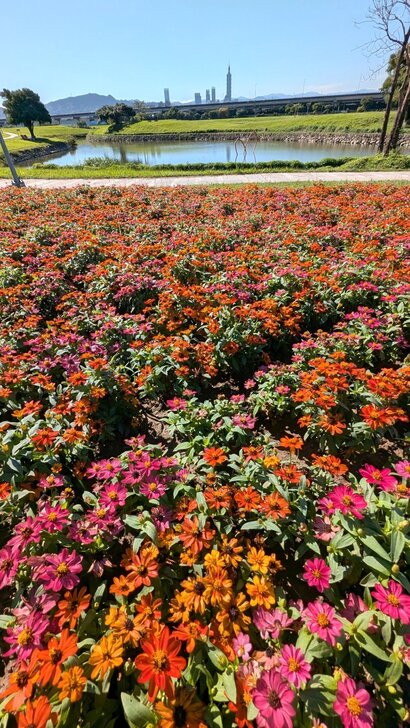 到了花海側邊,透過天使花、小百日草,遠遠瞧見101映在水灣中.↑↓