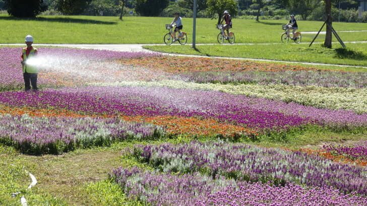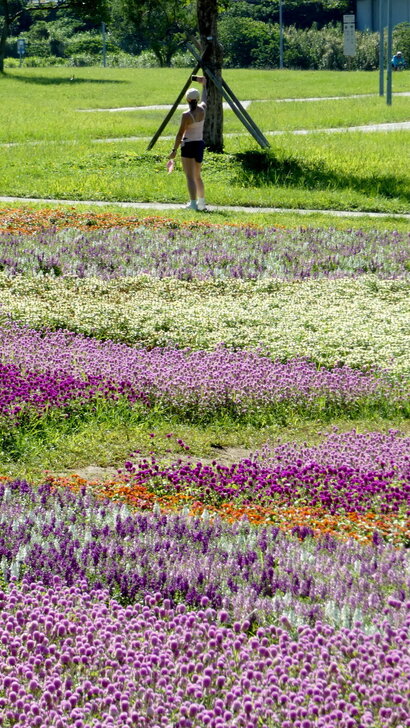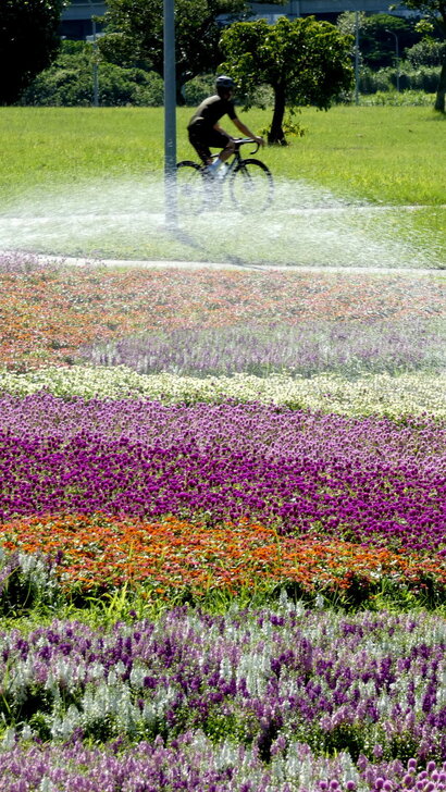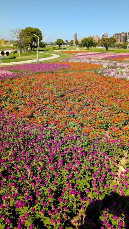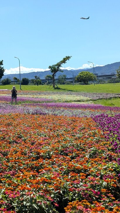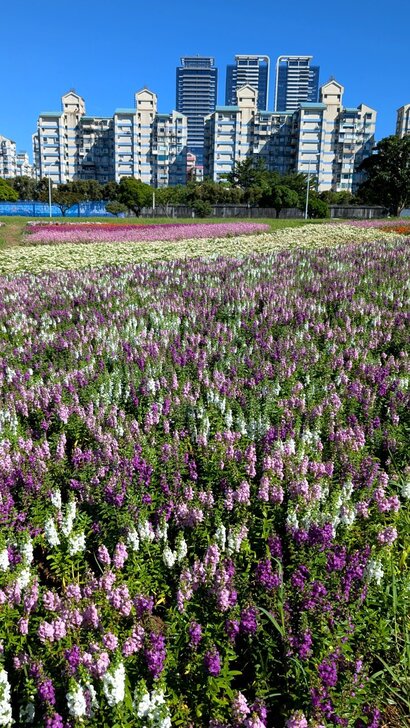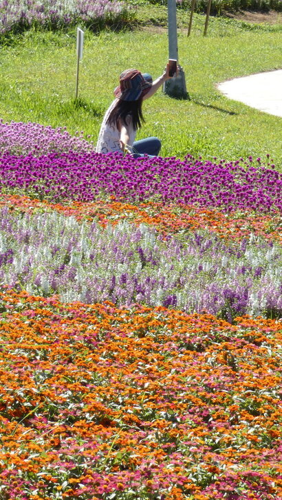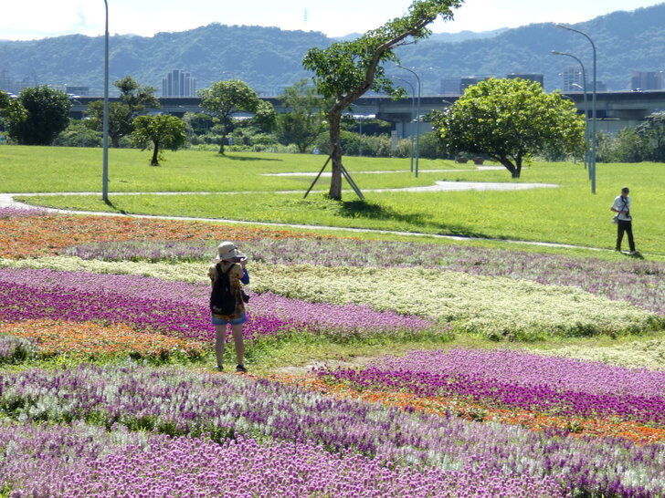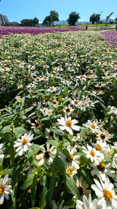 這花海在河濱公園茫茫綠地疏林中,似乎只有丁點大,可是置身其中,這片如漸層蛋糕的花海感覺很美!很大!↑↓