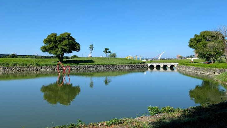 9/13看了大佳河濱公園的葵花後,就想著美堤河濱公園的花海應該也要出來了,可是沒看到什麼花訊,直到9月底才看到一、二則花訊,於是10/04搭了645公車在大直美堤花園站3下了車,對街就有youbike站,租了車往河濱騎去,穿過基16號水門就是美堤河濱公園,不過花海還要往左走一、二百公尺.↓