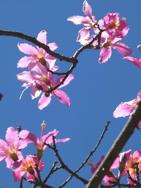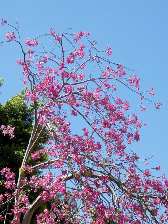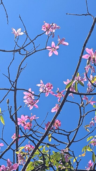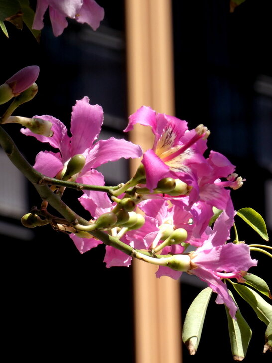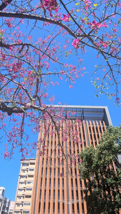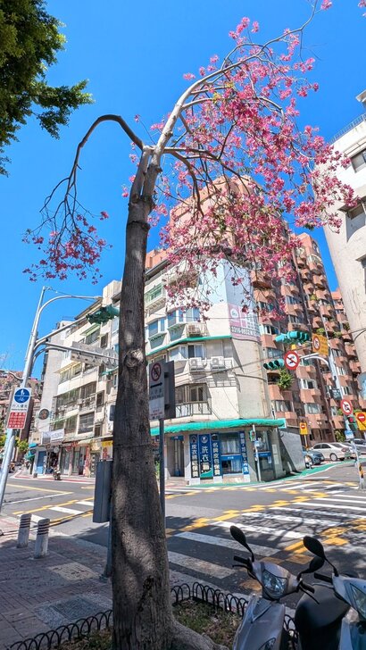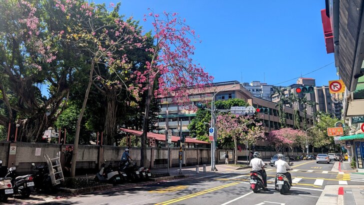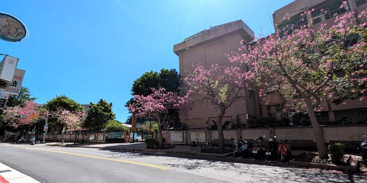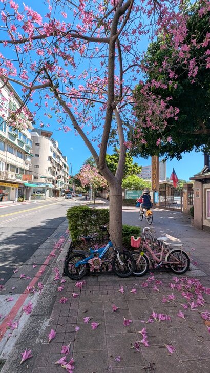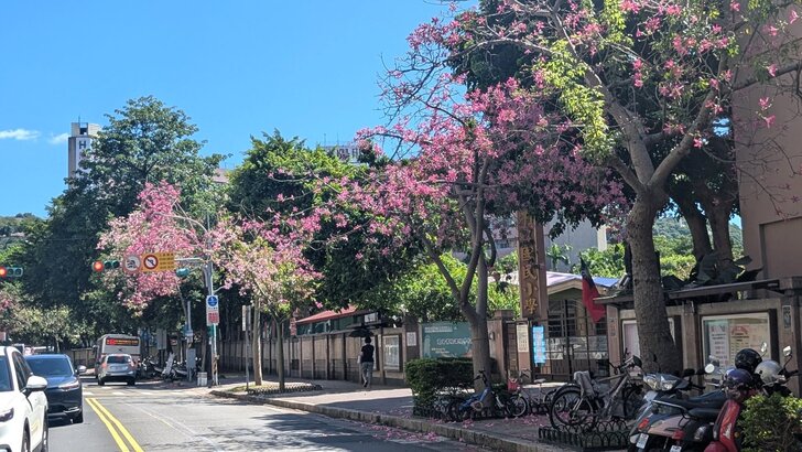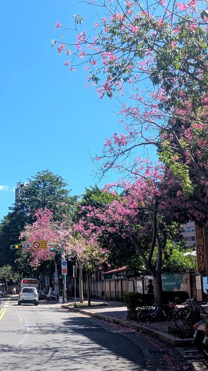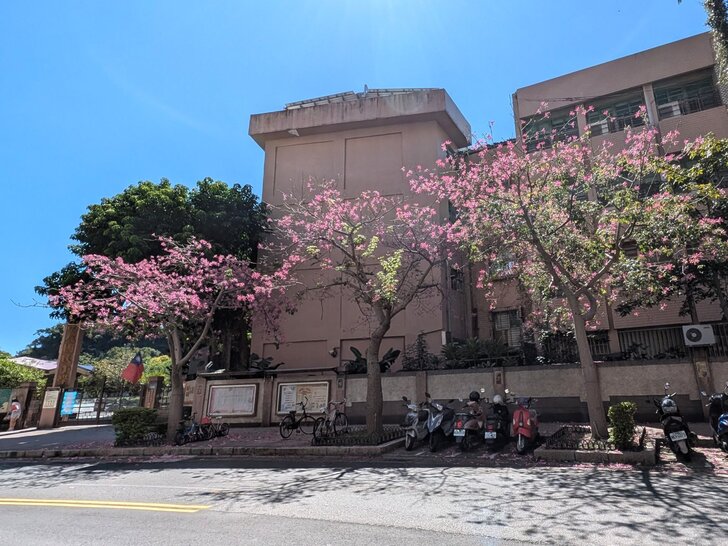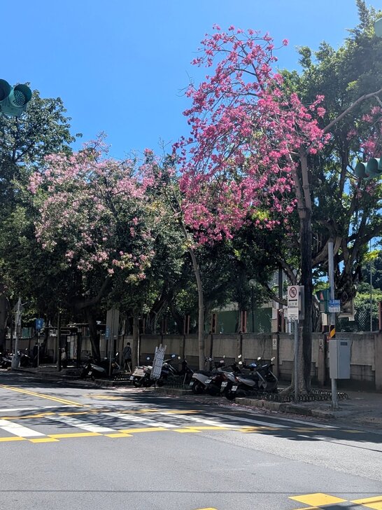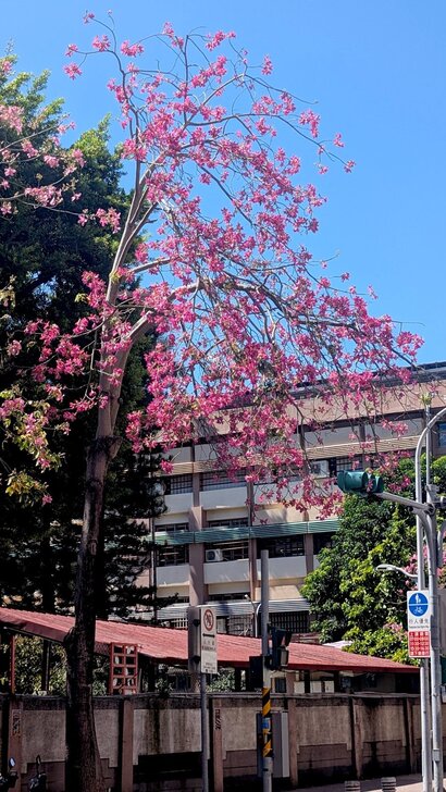 再搭645公車回到士林雨農國小站下了車,雨農國小正門前至陽明醫院有十來棵美人樹,這時開得正是桃紅美麗!↓