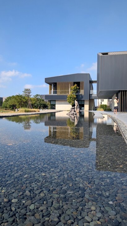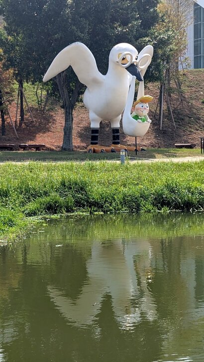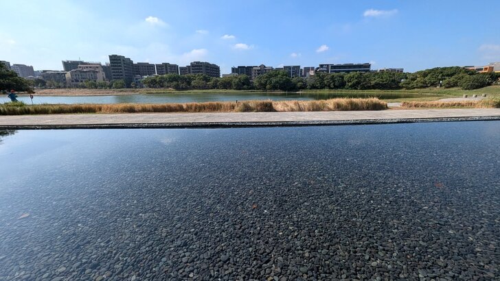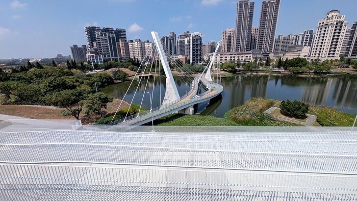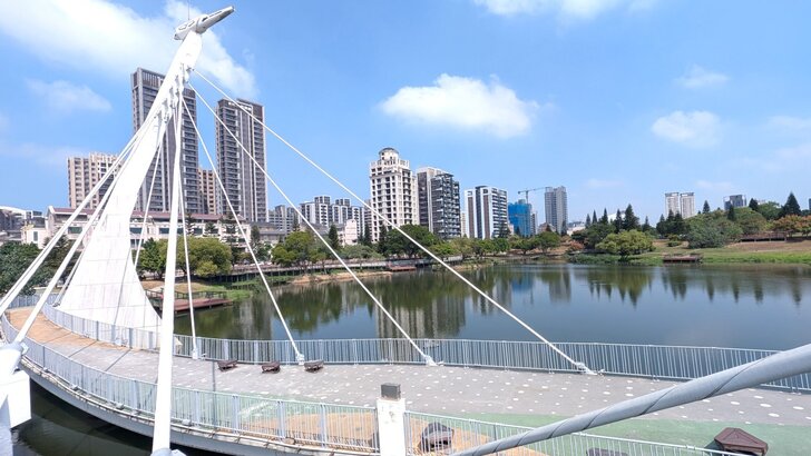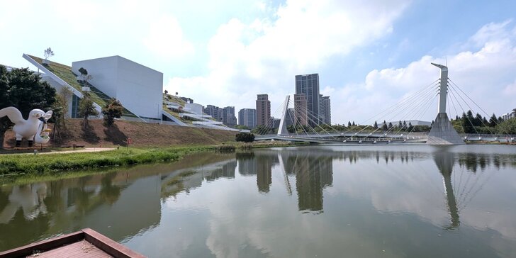 既然來了桃園,當然順便附近逛逛,除了溪海休閒農業區外,另選了兒童美術館及橫山書法藝術館,不過一在高鐵站南,一在高鐵站北,就先去看兒童美術館,距離1.3公里,單車騎高鐵南路7、8分也就到了,大門也不知在哪兒,旁邊偌大一個湖,先去湖邊繞繞逛逛.↓