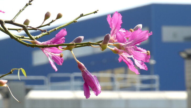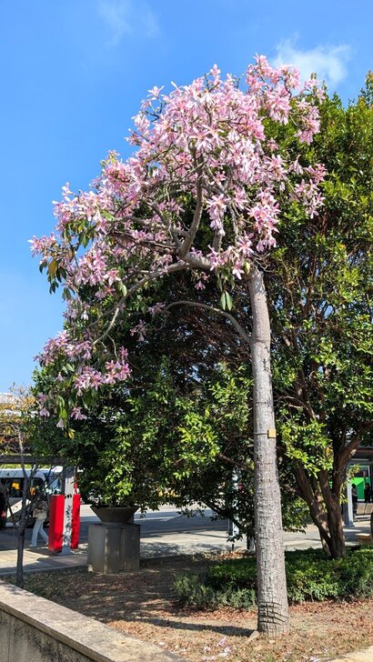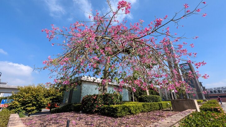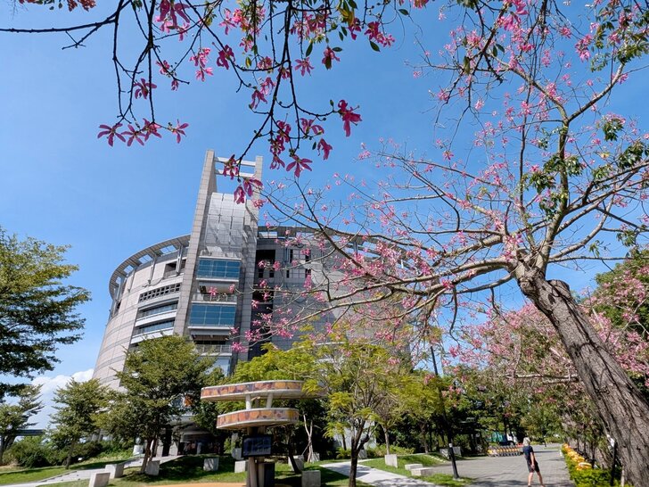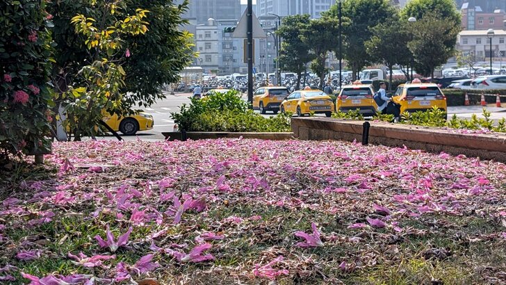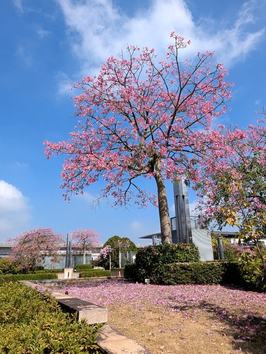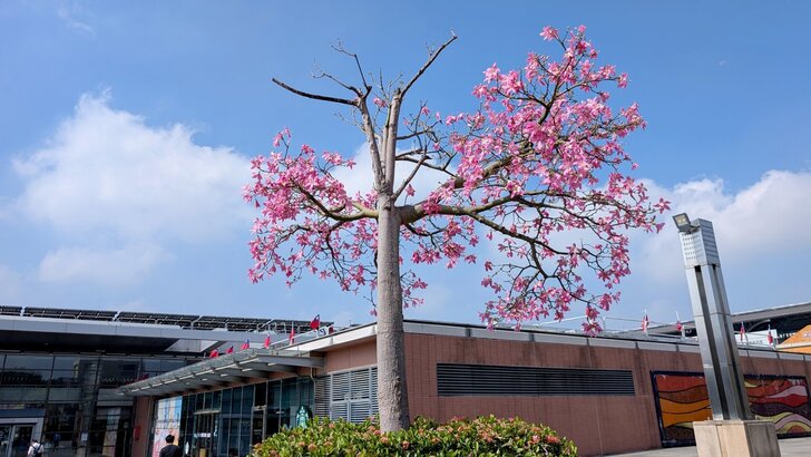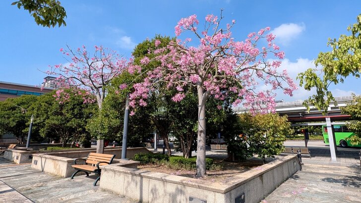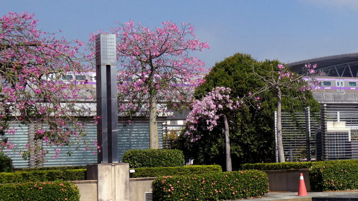 想起高鐵桃園站旁的花園也都是美人樹,這時應該開了,於是10/13搭了08:46班車到了桃園站,我從4號出口先到西南邊花圃觀賞,那秋花果然燦爛!↓