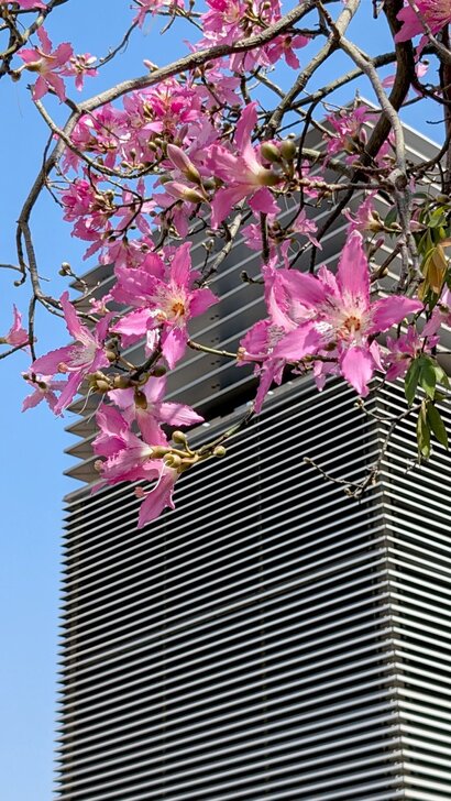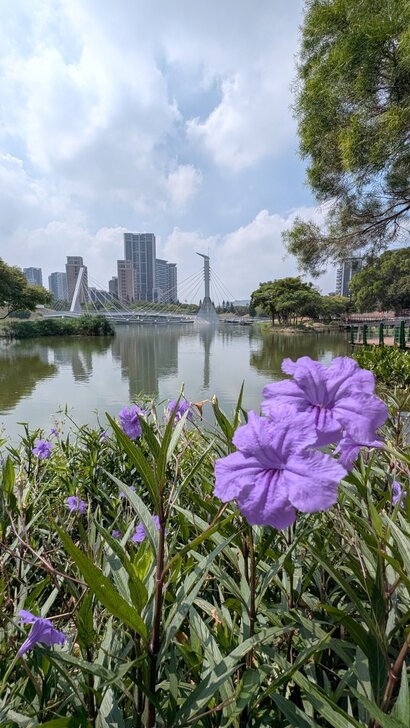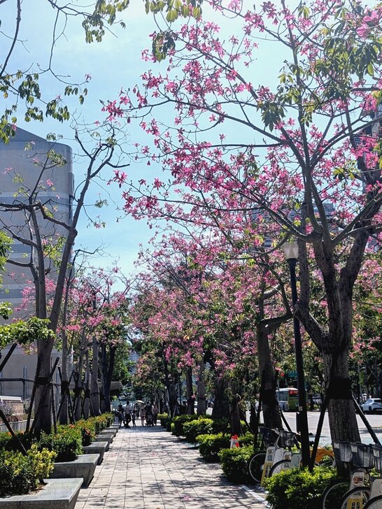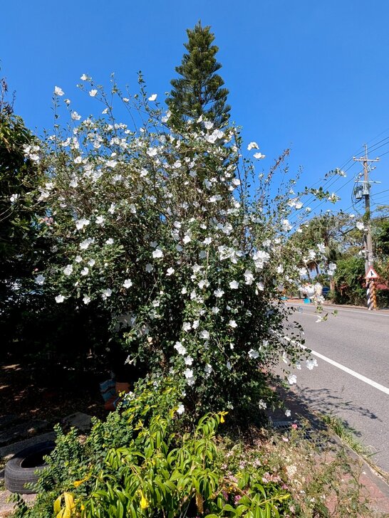 路邊現增設了youbike站,於是還了車,往園區走去,路邊有紫芸藤及白木槿盛開.↓