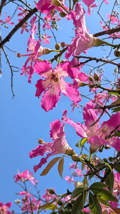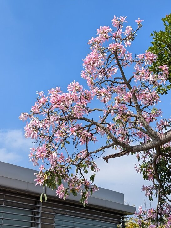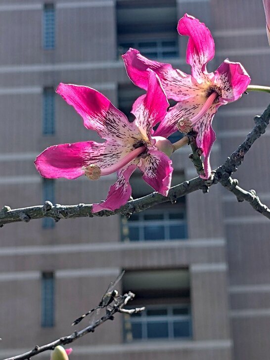 這裡美人樹品種大多洋紅色,只有這一株是淡粉紅色.↑↓