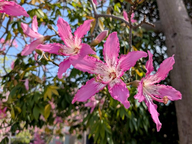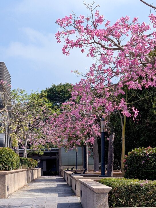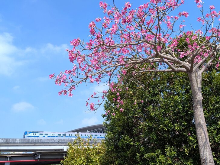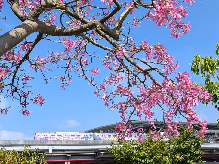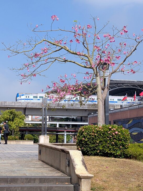 桃捷就在旁邊,難得能有捷運與美人樹同框畫面,於是我在烈日下等待,終於拍了幾幅畫面.↓