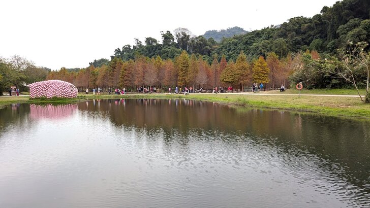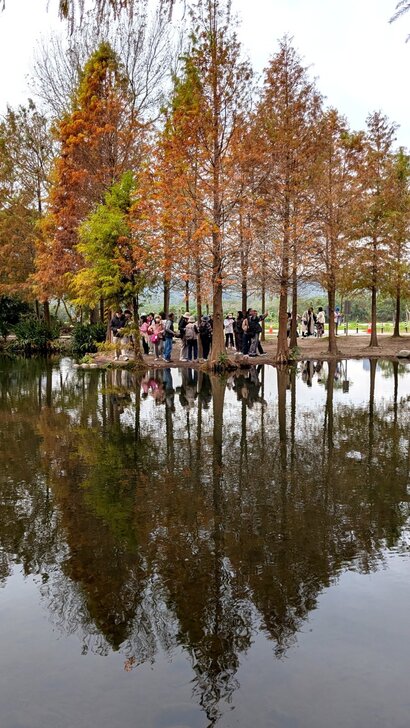 這池長約百米、寬約卅餘米,池邊及步道旁廣植落羽松(園區有幾個生態池,只有這個池有植落羽松.),每到紅葉期,天光樹影,水映紅衫(落羽松為柏科落羽杉屬),非常美麗!↑↓