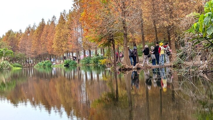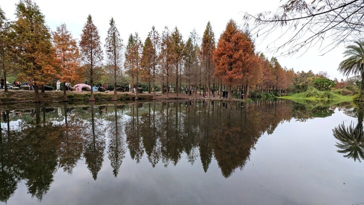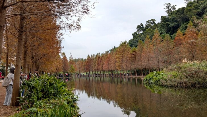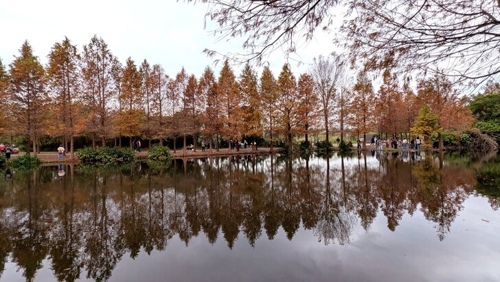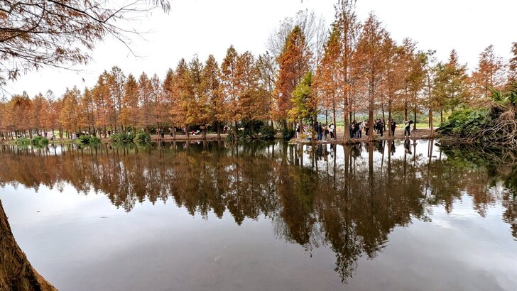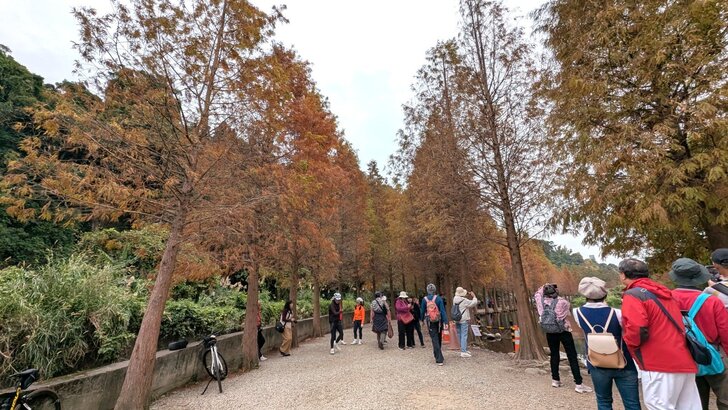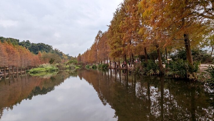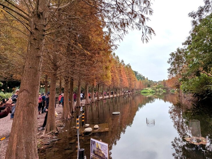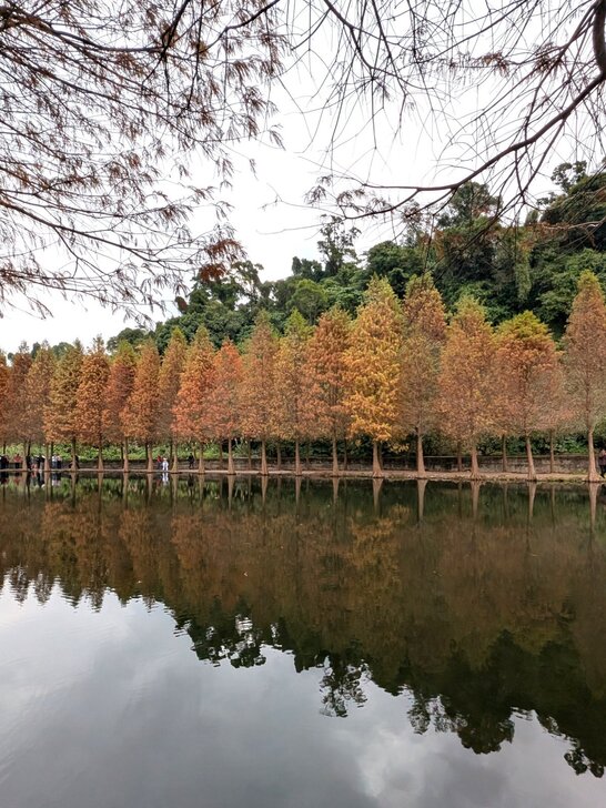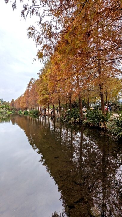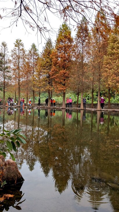 遠遠瞧見落羽松林,看來紅得剛好,可惜天色陰暗,氣象局預報的藍天毫無蹤跡,無奈啊!↓