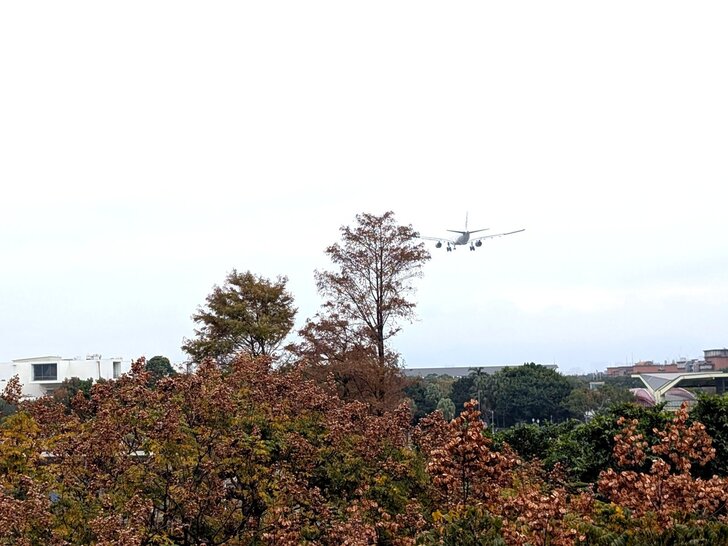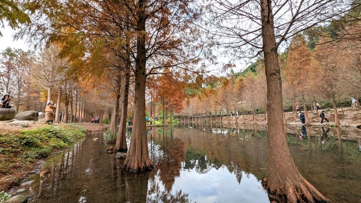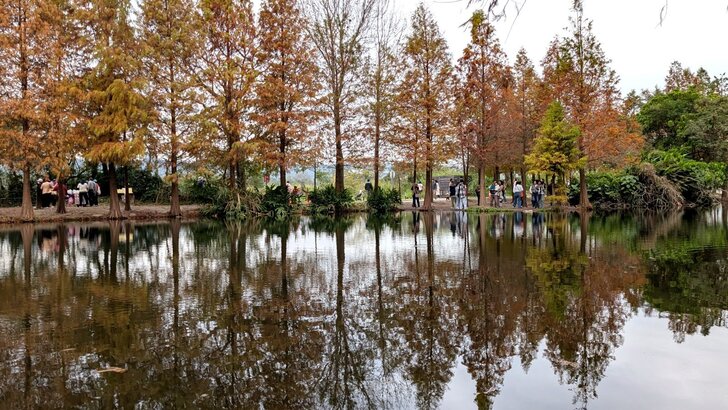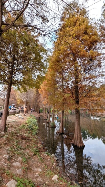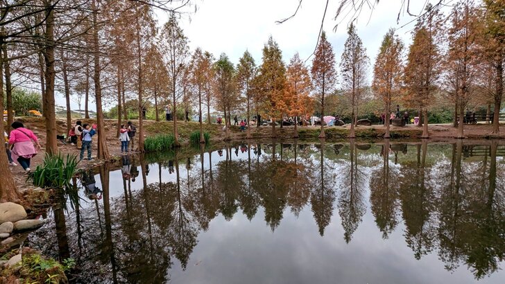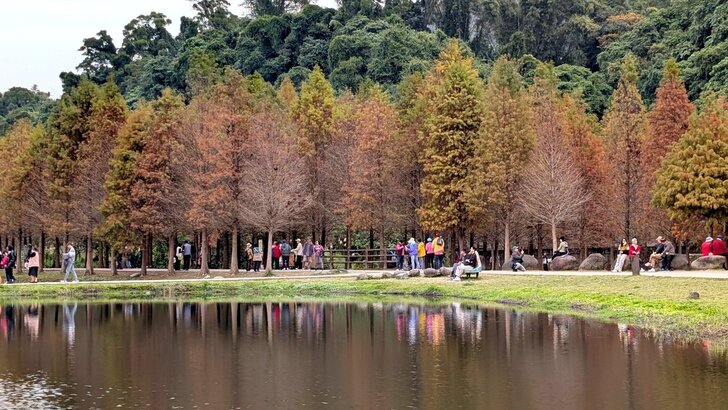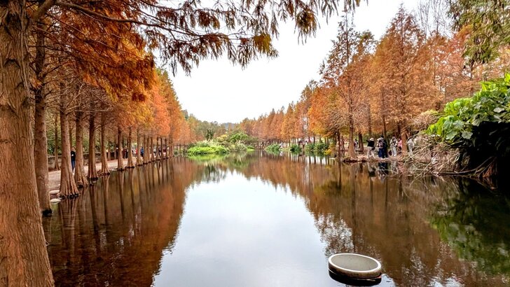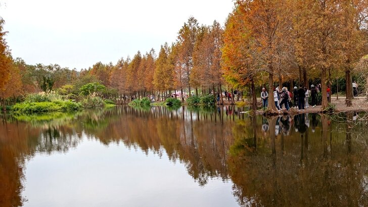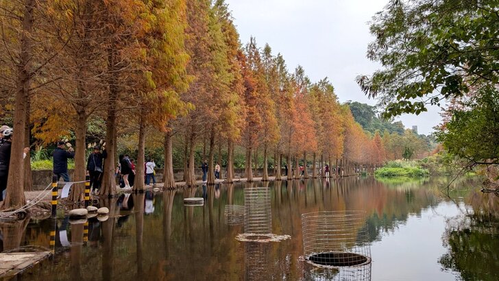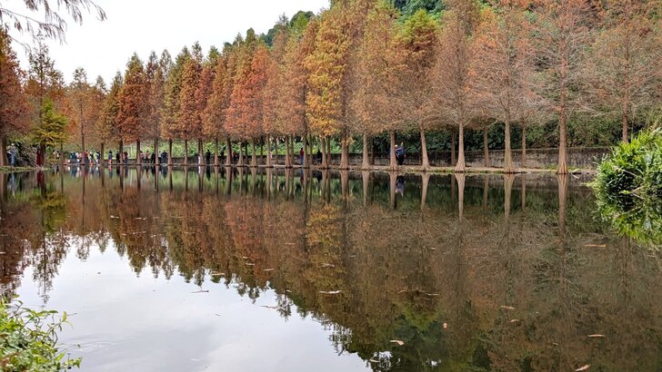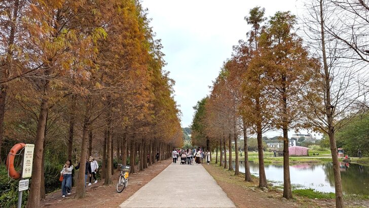 遠遠瞧見落羽松林,看來紅得剛好,可惜天色陰暗,氣象局預報的藍天毫無蹤跡,無奈啊!↓