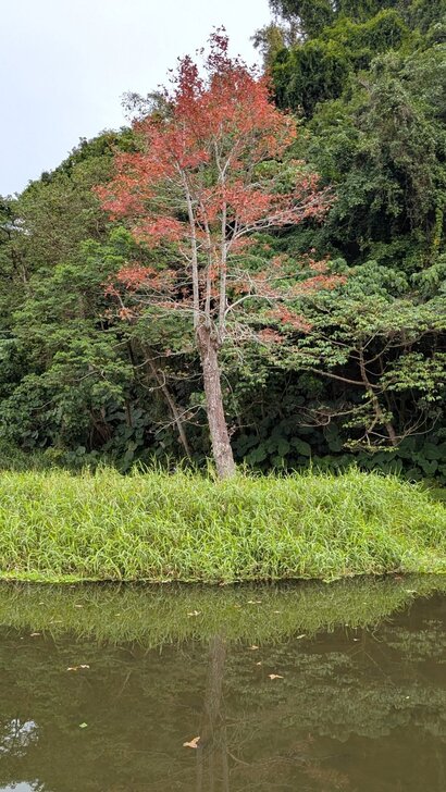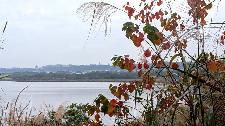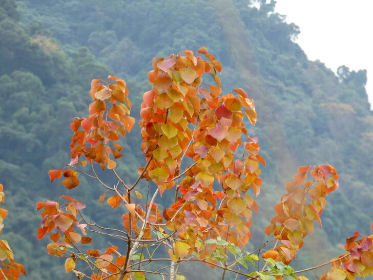 溪邊好多烏桕紅了葉,只是都被甜根子草遮住了,勉強從草縫中拍到幾張.↓