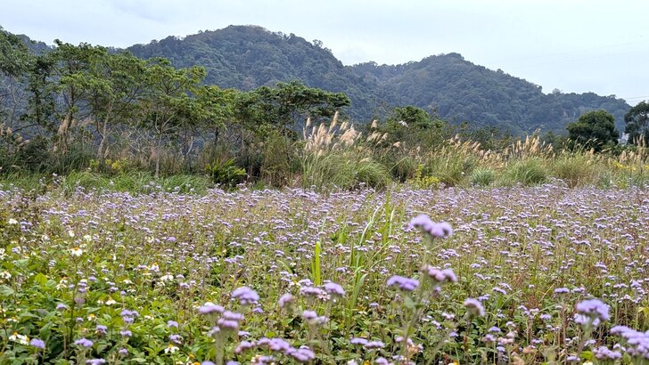 餐後通過中庄吊橋,沿著大鶯綠野自行車道往鶯歌騎去,路旁荒地紫花霍香薊正開著.↓