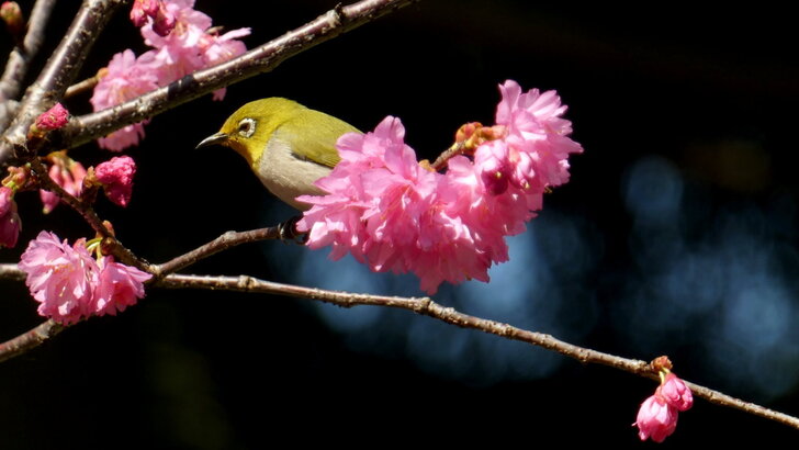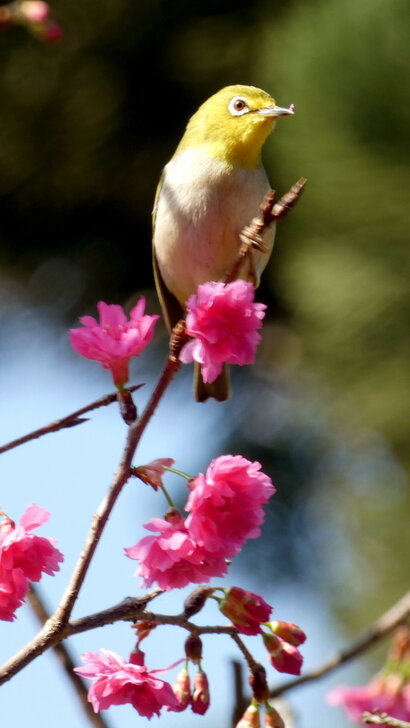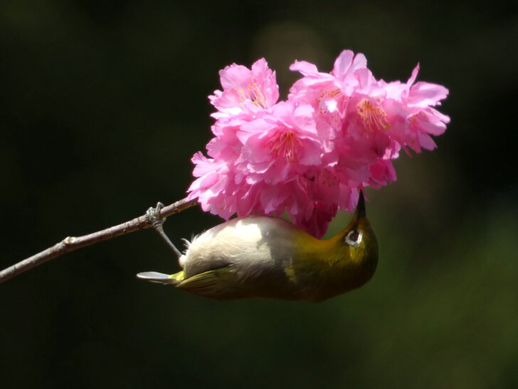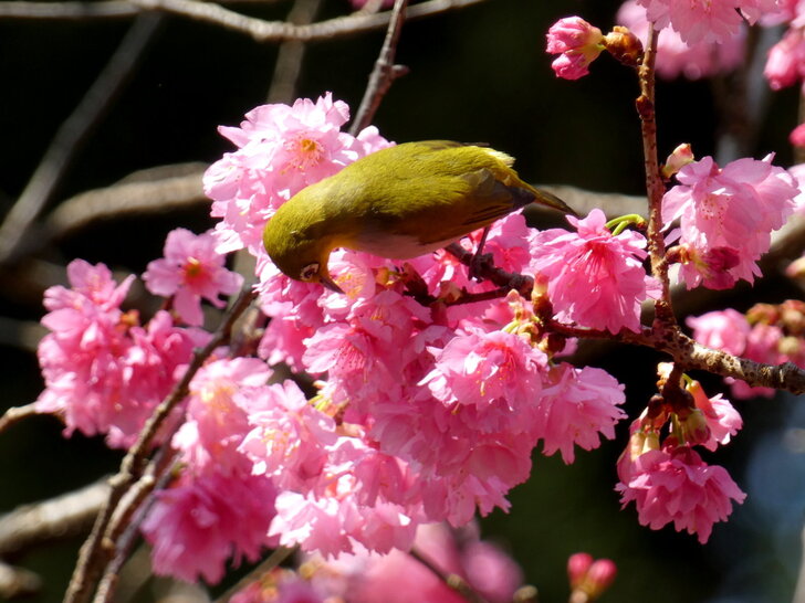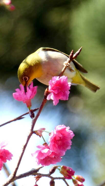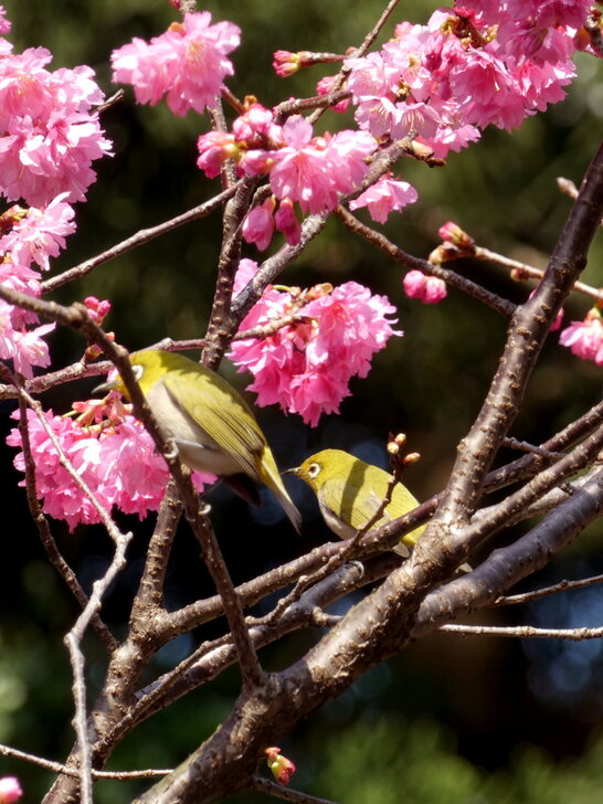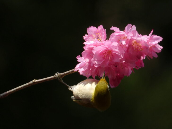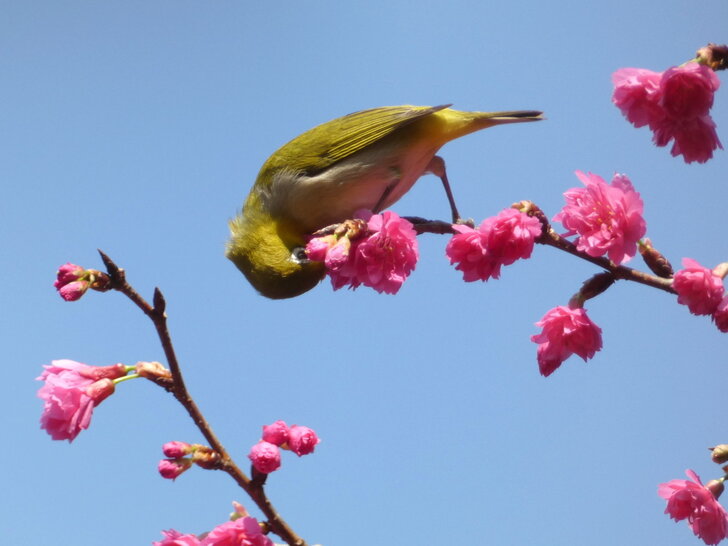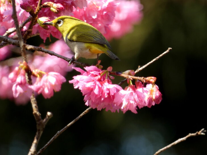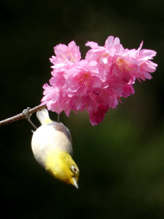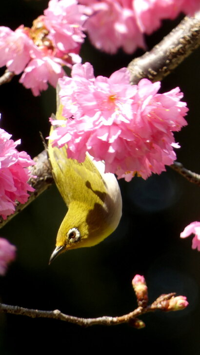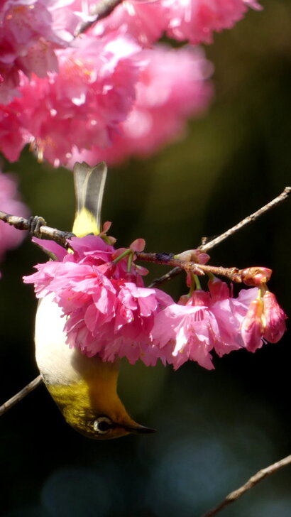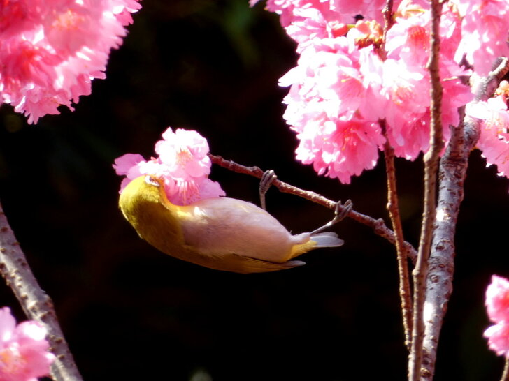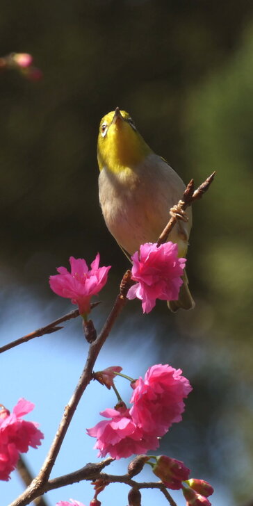 八重櫻花道上有一株盛開,吸引許多綠繡眼前來,於是拿起類單相機拍了許久,讓此行有些收穫.↓