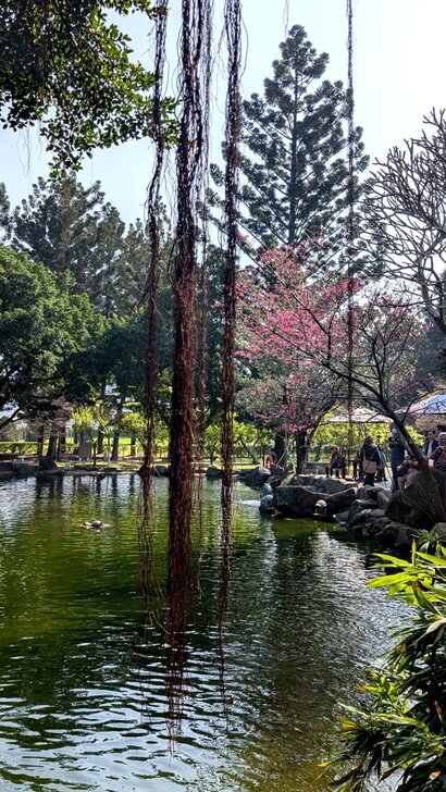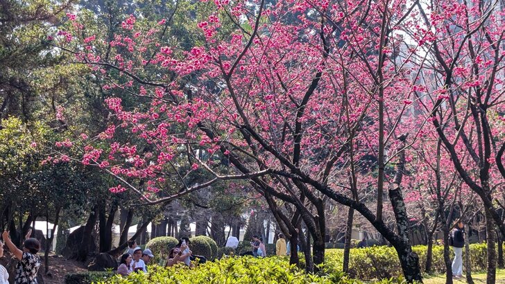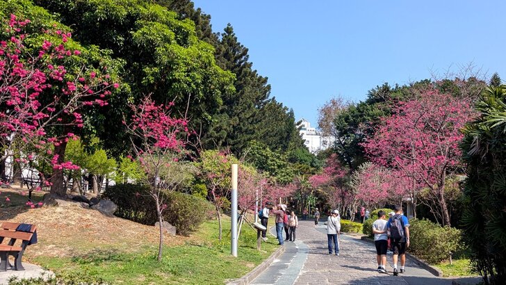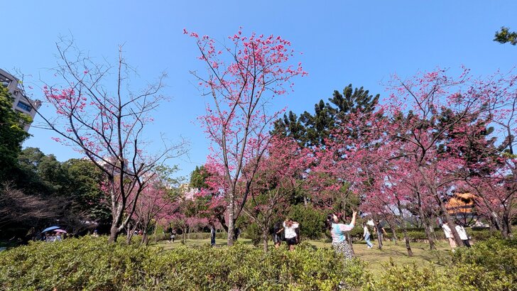 過雲漢池不遠,八重櫻園花已開,吸引遊客林內林外打卡.↓