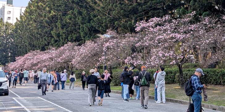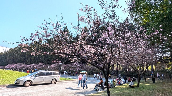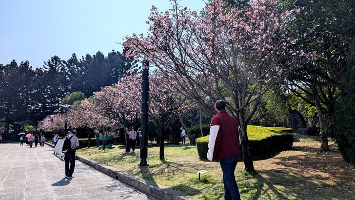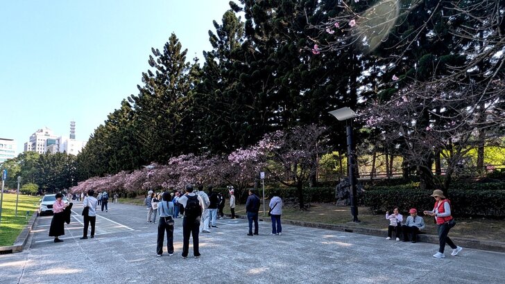 修善寺寒櫻與紀念堂後面整排的大漁櫻連成一氣,遊客都在花下攝影或休憩.↑