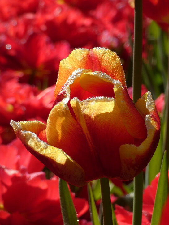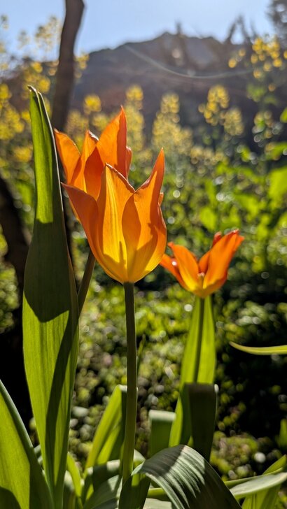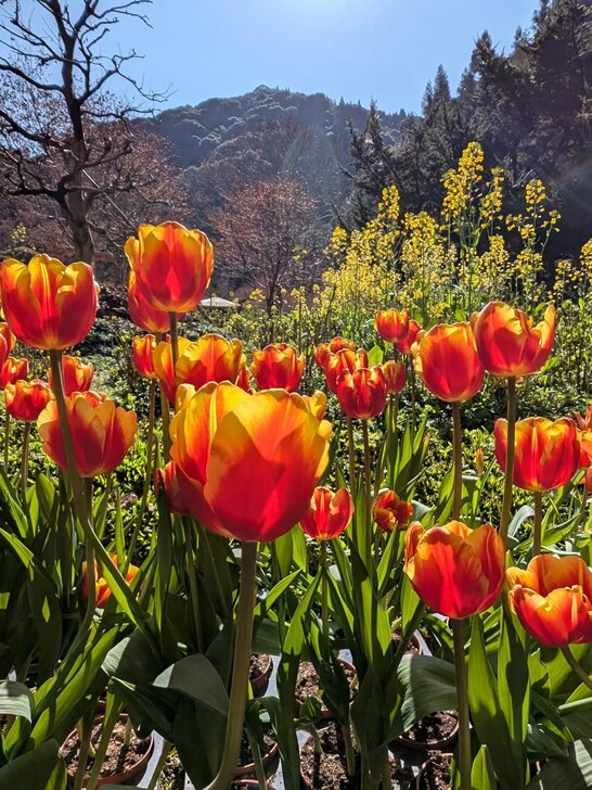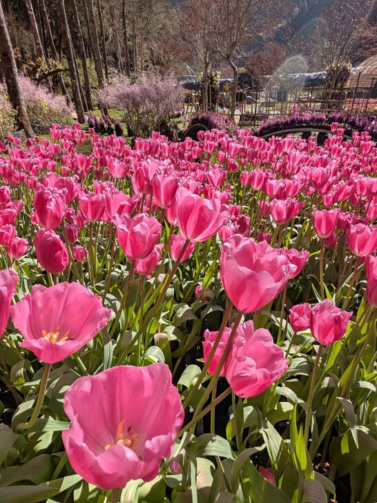 續往上走就是鬱金香區,這裡的花朵品種雖比不上士林官邸鬱金香展,但也是種類、顏色繁多,迎著朝陽肆意招展,也是讓人目不暇給的.↓