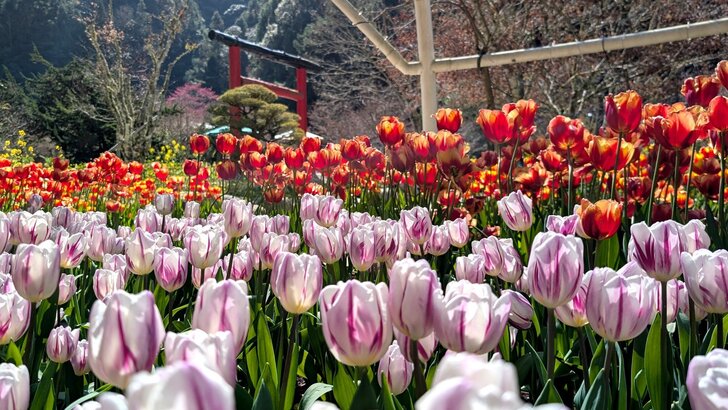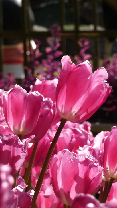 沿著花廊走下,兩旁都是奼紫嫣紅的鬱金香盆栽.(這原本是紫藤花的花廊,可惜我沒在紫藤花開時來過,不知花景如何,或者可考慮花開時再來賞花.)↓