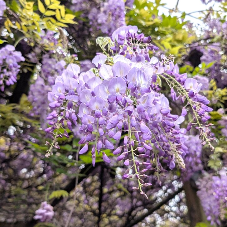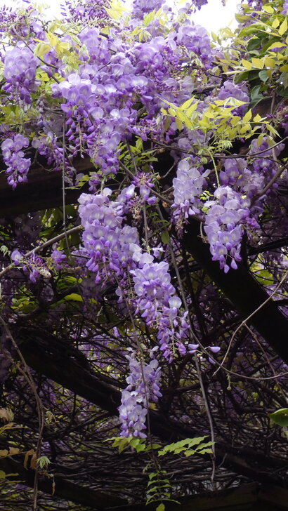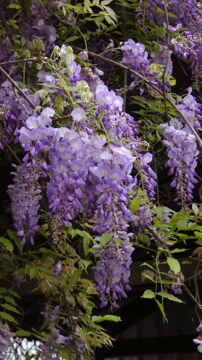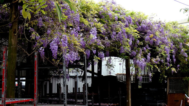 沒時間觀賞櫻花,先去公車轉運站最旁邊處等免費公車,公車剛走,服務人員說10分(大概因星期天賞花人多吧)就有一班,果然下一班公車很快就來到;11:14到了溪海休閒農業區,沿路走往會場,經過一園藝所,見紫藤花廊滿開,以及裡面無數花卉,幾乎大家都進去參觀,而我被紫藤花所迷,沉迷許久.↓