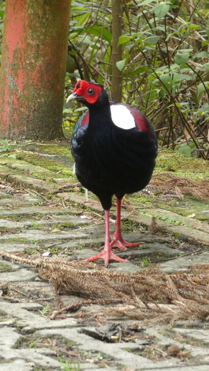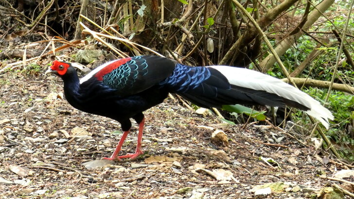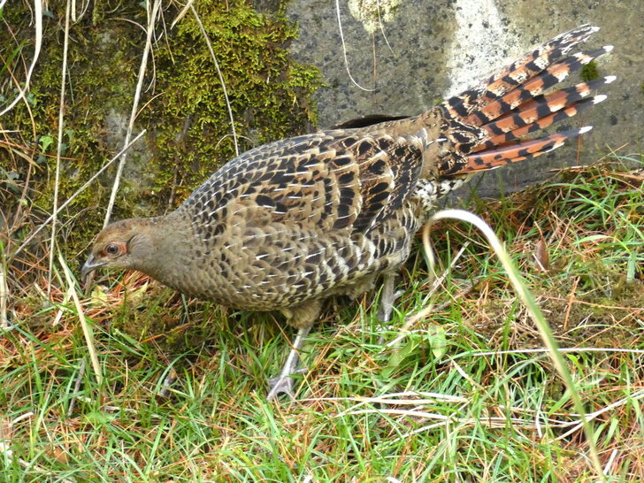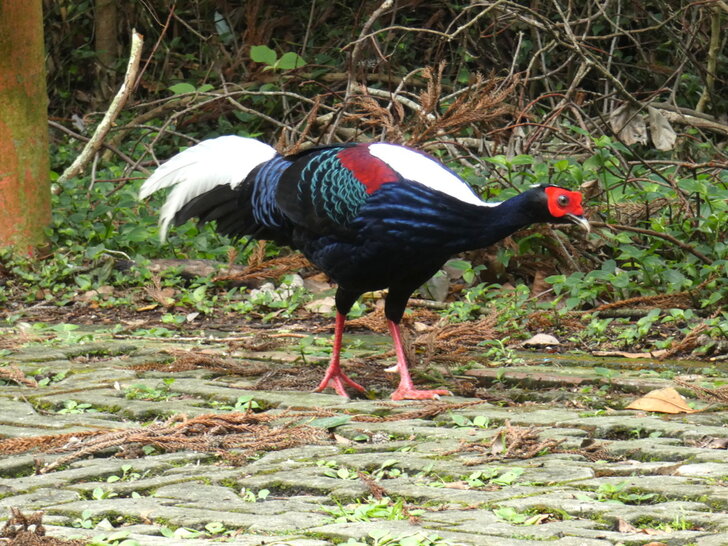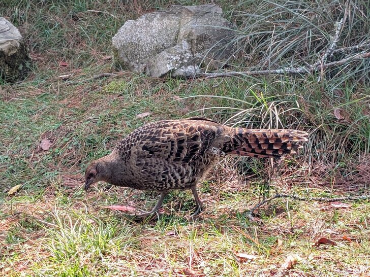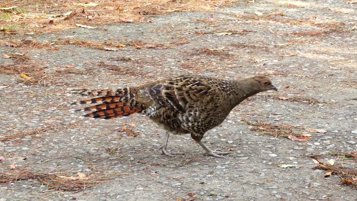 一隻雌帝雉在路上悠閒地覓食.↓