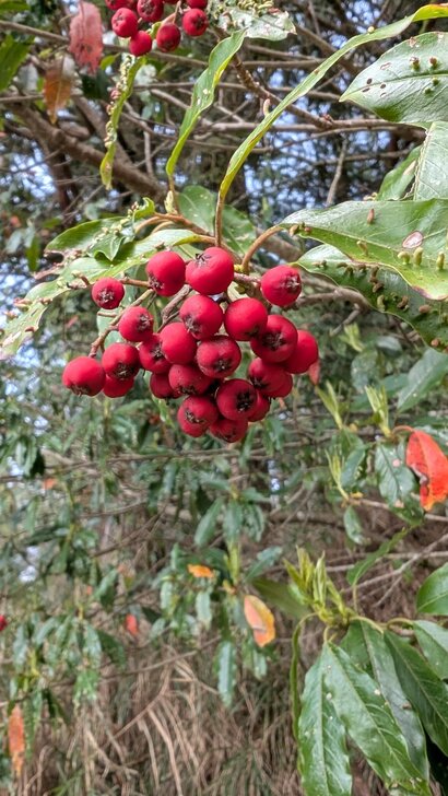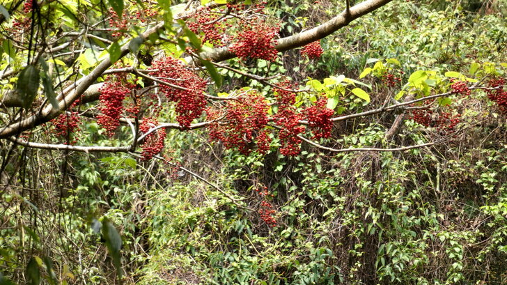 我們欣賞藍腹鷴很久,因也沒聽到什麼其他鳥聲,就繼續上路,開沒多遠,見到一株結著紅果的山桐子,就停車等待看看,等了許久都沒見到鳥兒來覓食,難道春天的山桐子不好吃嗎!?(山桐子大多在冬季結實)↓