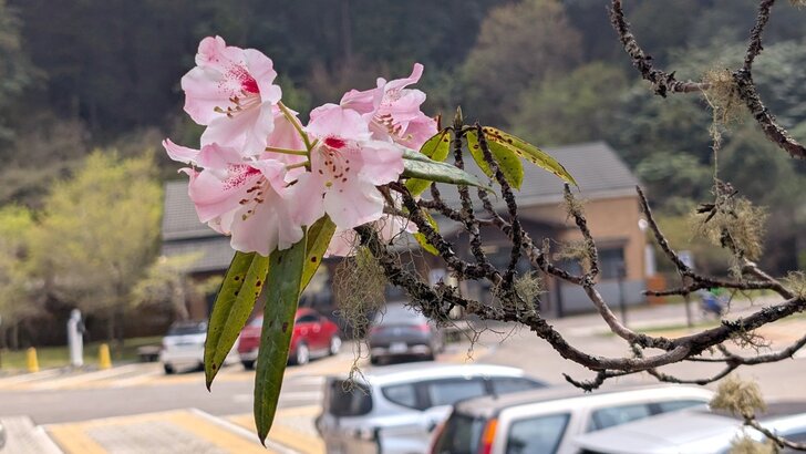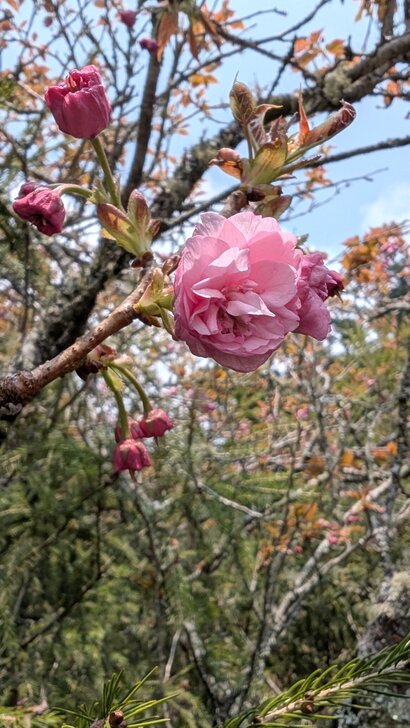 過了收費站,我們在停車場休憩用餐後,就繼續上到遊客中心,中心入口處有著玉山杜鵑及牡丹櫻開著.↓